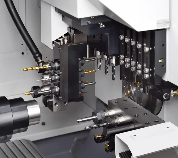 - The multi-axis design and use of live tooling allow operations on both the front and back of the part simultaneously, reducing cycle time and improving repeatability.